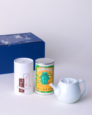 日本茶代表選手の煎茶と親しみやすいほうじ茶、万能型2種の詰合せ。どんな時でもこれがあれば助かる、嬉しい・安心のコンビ。さらに、シンプルながらお茶をおいしく淹れるこだわりが詰まった「白磁ティーポット」もあれば、毎日大助かり。