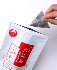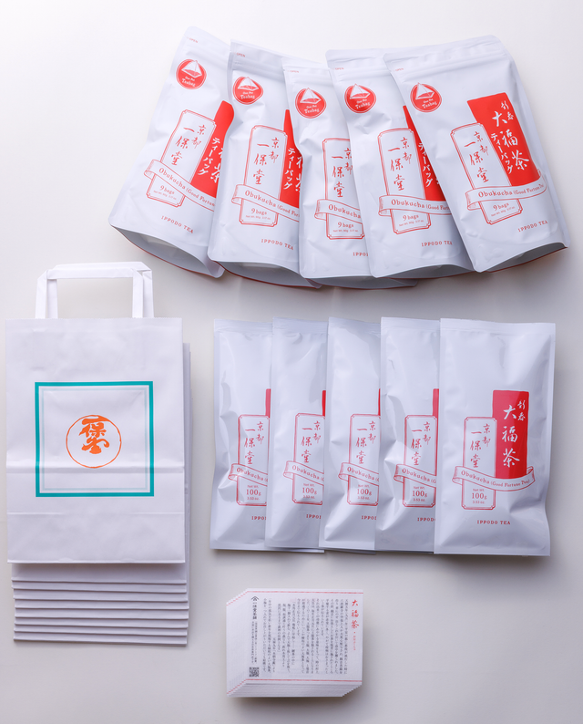 お配り用やご自分用に、複数ストックしておくと便利なお茶。「大福茶」はこの時季ならでは縁起もの、贈りものにも最適です。お渡しの際に重宝する袋もセットにしました。