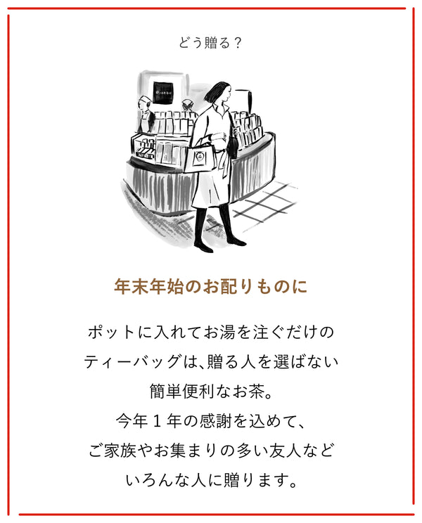 お年賀といえば大福茶。1ポット用ティーバッグ「三角茶袋」なら、後始末もなく、忙しい年末年始の差し上げものにぴったりです。ご飯といっしょにたっぷりお茶を召し上がるご家族や、お茶好きさんに。