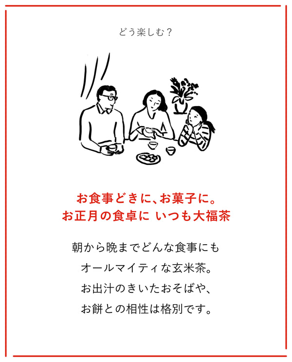 一年の邪気を払い、新年をお祝いする縁起物のお茶。平安時代にその起源をもちます。大福茶として詰められるお茶は、お茶屋さんによって様々です。一保堂の大福茶は、特別仕立ての玄米茶。いつもの玄米茶よりも上等な茶葉を使い、お米の量は少なめなので、茶葉の美味しさを存分に楽しめます。