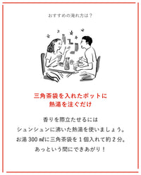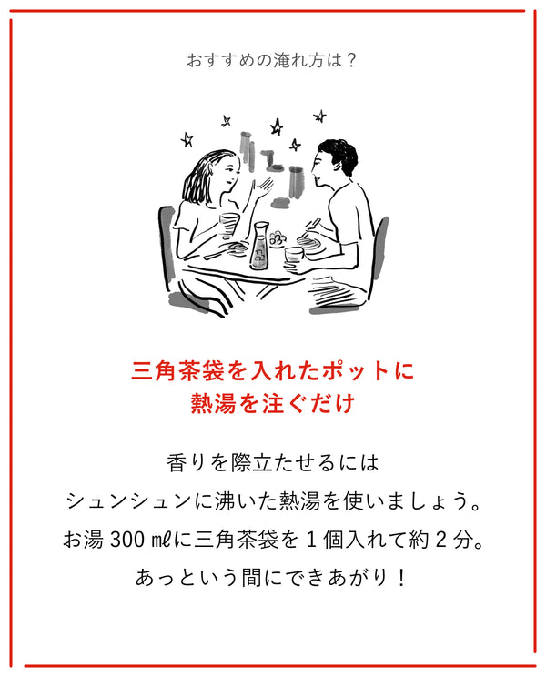 起き抜けの朝にアツアツのお湯で香り高く淹れて、目覚めの一杯に。軽やかなあと口なので、お食事時には名脇役として見事に活躍してくれます。この時季は、場面を問わずついつい手を伸ばしてしまいます。